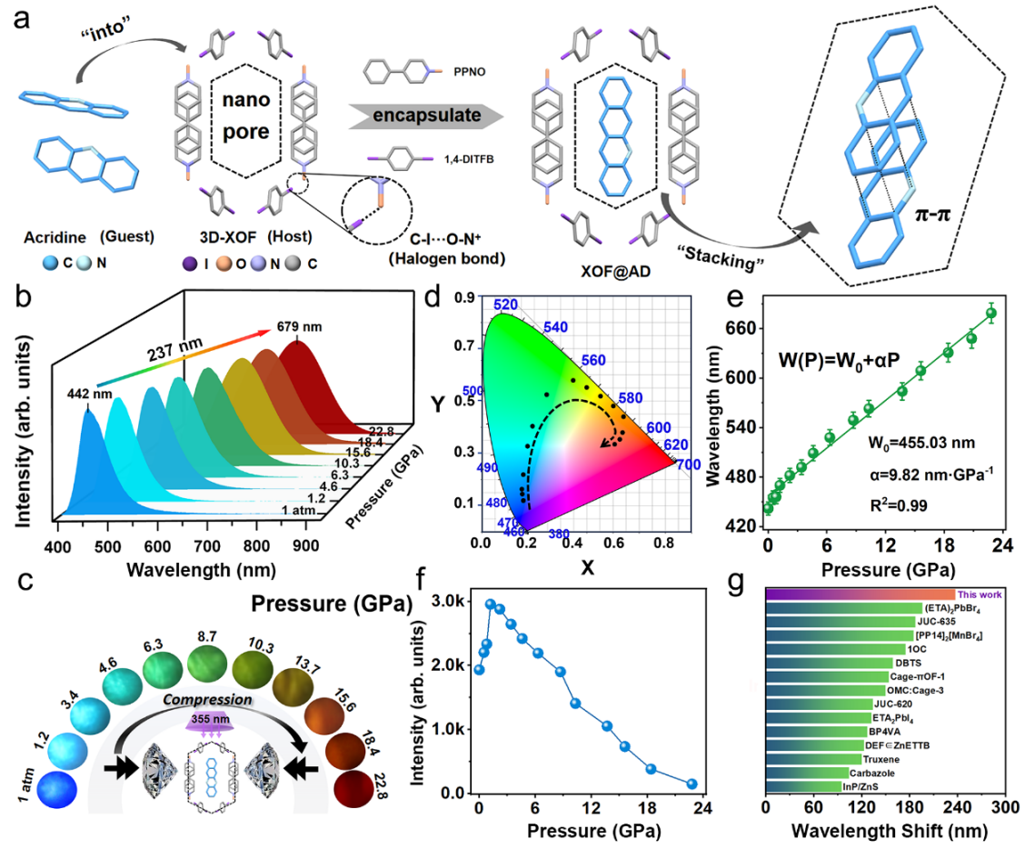在本工作中,杨新一教授课题组选择主客体材料XOF@AD为研究对象。通过将吖啶(AD)分子作为客体封装在刚性的XOF中,实现了237 nm的全可见光谱压致变色。该材料在高压下展现出从深蓝色(2.81 eV)到红色(1.83 eV)的显著荧光红移,其性能优于此前报道的可见光谱范围内压致变色材料。结合原位高压光谱表征与密度泛函理论计算分析表明,XOF中增强的π–hole···π相互作用通过降低其相互作用能以保持XOF在高压下的结构刚性。这有效抑制了AD客体在高压下的结构无序,同时保持其固有的π–π堆积构型。高压下AD客体之间增强的π–π堆积相互作用使带隙不断减小,进而实现全可见光谱压致变色。该研究首次揭示了基于主客体策略的3D-XOF材料可以作为一种优秀的平台,不仅可以实现具有全可见光谱特性的压致变色性能,也为可见光区的高灵敏度压强传感应用提供了广阔前景。