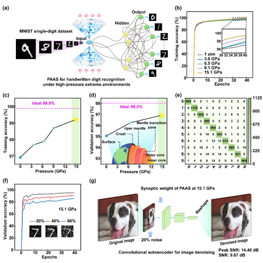 在本研究中,李顺心课题组构建了一种基于VO₂(M1)纳米颗粒的压力自适应人工突触(Pressure-adaptive artificial synapses, PAAS)。该器件能在从常压(1 atm)到15.1 GPa的高压环境下稳定且高性能地工作。其机理在于:从M1相(1 atm)到M1’相(高于15.1 GPa)的相变过程中,压力抑制了VO₂(M1)在光诱导绝缘体-金属相变中的Peierls路径(M1R结构相变),使得Mott机制(电子相变)占主导。得益于这一机制,PAAS在高压下的仿生可塑性显著增强,其最大配对脉冲易化指数从109.6%提升至155.4%;同时,其突触后电流的线性度也得到改善,Pearson相关系数从0.64提升至0.97。此外,即便在地壳下部的压力环境(约3 GPa)中,PAAS仍能保持完整的仿生学习功能。基于上述性能,该器件成功展示了其在高压神经形态计算中的应用潜力:在手写数字识别任务中实现了97%的准确率,并能基于卷积自编码器完成彩色图像的降噪与重建。